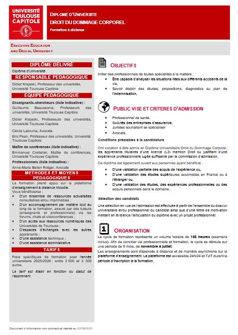 • auprès du service Executive Education and Digital University (EEDU) de l’Université Toulouse Capitole : Kerwan Gholami, Manufacture des Tabacs, 21 allée de Brienne, Bâtiment Q, 1er étage