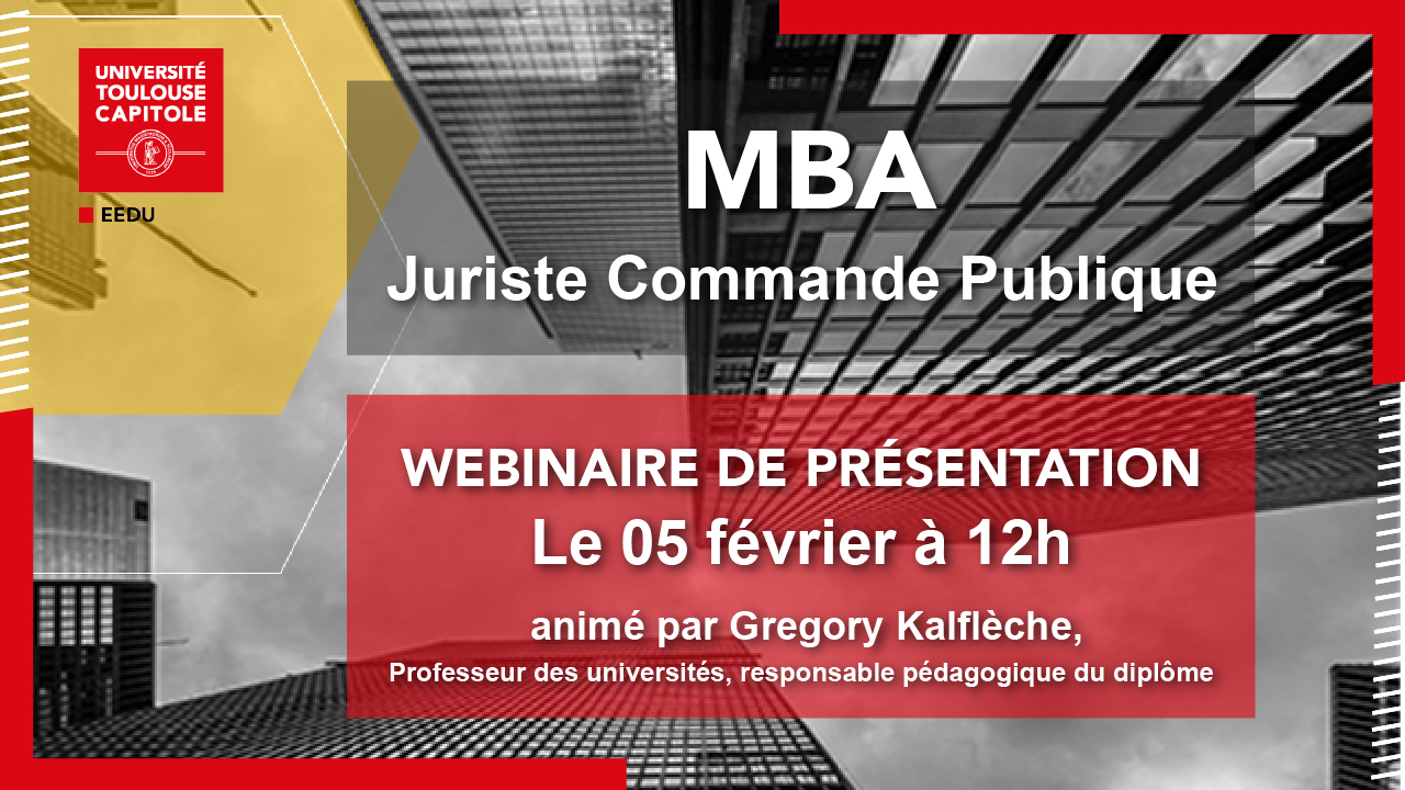 L’Université Toulouse Capitole vous invite à un webinaire de présentation du MBA Juriste Commande Publique, une formation diplômante dédiée à la maîtrise des procédures de passation, d’exécution et de contentieux des contrats publics. Ce temps d’échange vous permettra de découvrir les objectifs du diplôme, son organisation pédagogique et les modalités de candidature avant la rentrée de mars 2026.
