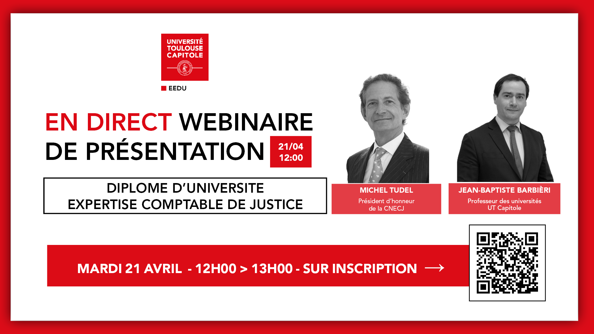 Retrouvez Michel Tudel, Président d'honneur du CNECJ et Jean-Baptiste Barbièri, Professeur des universités à UT Capitole, pour une présentation du D.U. Expertise-Comptable de Justice. Cette formation s'adresse aux experts-comptables et commissaires aux comptes, désireux de diversifier leurs activités en se dirigeant vers des missions d'Expertise de justice ou de conciliation.