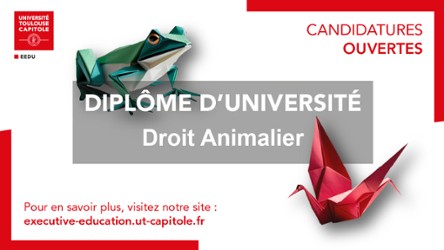 - Candidatez pour intégrer la nouvelle promotion du Diplôme d'Université Droit AnimalierLe Diplôme d'Université Droit Animalier propose une formation dans le domaine du droit applicable à l’animal, matière largement ignorée du tronc commun des études de droit. Pourtant, à bien y regarder, l’animal est partout et les relations que l’homme entretient avec lui, sont autant quotidiennes que millénaires. Comprendre la place qu’occupe l’animal aujourd’hui dans notre société, le statut juridique qui lui est applicable, le traitement qui lui est réservé, participe à une démarche à la fois citoyenne et éthique.En savoir plus
