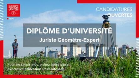 - DU Juriste Géomètre-Expert : candidatures ouvertes jusqu’au 27 février 2026Formation universitaire unique en France, le Diplôme d’Université Juriste Géomètre-Expert répond aux évolutions juridiques, techniques et environnementales du métier de géomètre-expert. Il s’adresse aux juristes et aux professionnels du secteur souhaitant élargir ou approfondir leurs compétences juridiques dans les domaines de l’urbanisme, de la copropriété et du foncier, au sein d’un cursus professionnalisant porté par l’Université Toulouse Capitole.En savoir plus