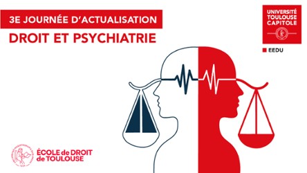 - 3e journée d’actualisation « Droit et psychiatrie » - 22 Juin 2026Organisée par l’EEDU de l’Université Toulouse Capitole, cette journée d’actualisation en droit et psychiatrie s’adresse aux professionnels du droit et de santé. À travers des échanges de pratiques et des interventions d’experts, cette session vise à clarifier les évolutions législatives récentes et à renforcer la sécurité juridique des pratiques de soins sans consentement. Isolement, contention, UMD, USIP : les dernières décisions constitutionnelles et judiciaires seront analysées afin d’outiller les participants face aux exigences du contrôle juridictionnel et aux garanties des droits des patients.En savoir plus