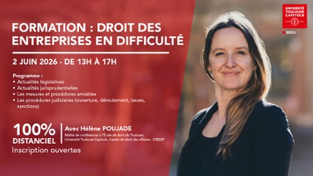 - Actualités en Droit des entreprises en difficulté - Formation courte 2 juinFormation 100 % à distance dédiée aux actualités du droit des entreprises en difficulté. Elle permet d’actualiser ses connaissances sur les dispositifs de prévention et de traitement des difficultés à la lumière des dernières évolutions législatives et jurisprudentielles, dans une approche opérationnelle et sécurisée.En savoir plus